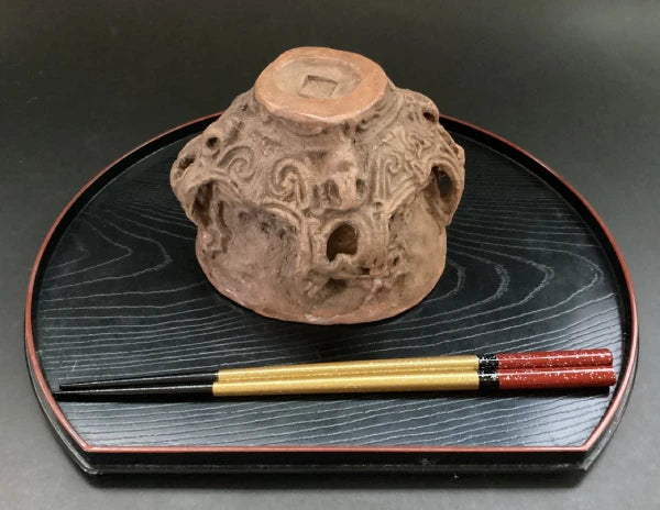 Se denomina Jōmon doki, al estilo de artesanía japonesa producida durante la era Jōmon, con un diseño creado presionando cuerda de paja sobre la superficie de las piezas