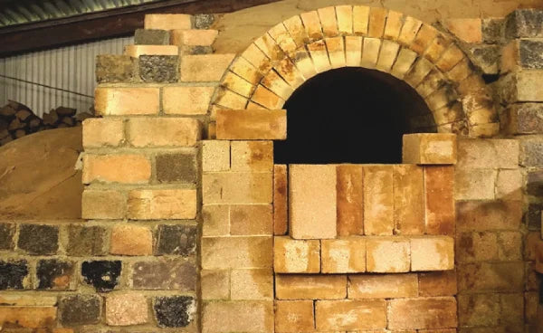 - Cocción (esmalte) - Para la cocción final de las piezas, se utiliza madera en un kiln ascendente de cámara simple conocido como anagama. Las piezas que corren el riesgo de fundirse, se cuecen en la abertura inferior del horno, alineadas con la parte trasera del kiln, hasta que la temperatura alcanza los 1000°C. El horno tarda unas 15 horas en alcanzar dicha temperatura y es en ese momento cuando da comienzo la cocción horizontal en la parte baja del kiln. En la parte alta sin embargo, la cocción horizontal no da comienzo hasta que se han alcanzado los 1300°C. Las piezas se cuecen durante unas 40 horas y se dejan enfriar dentro del kiln aproximadamente una semana antes de retirarlas.