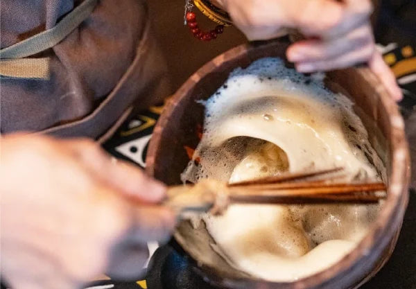 El bol en el que se prepara el bote bote cha es alto y está hecho de hierro.