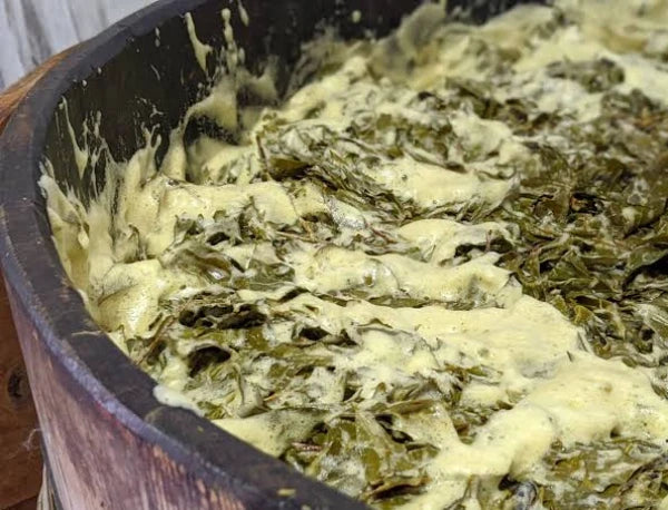 Se elabora siguiendo un proceso tradicional de doble fermentación, primero se lavan y se vaporizan las hojas. Después, se introducen en un barril de madera y se llevan al monte para que fermenten de forma aeróbica gracias a los microorganismos del entorno. Una vez listas, las hojas se enrollan de forma manual y fermentan de forma anaeróbica, gracias a las lacto bacterias.