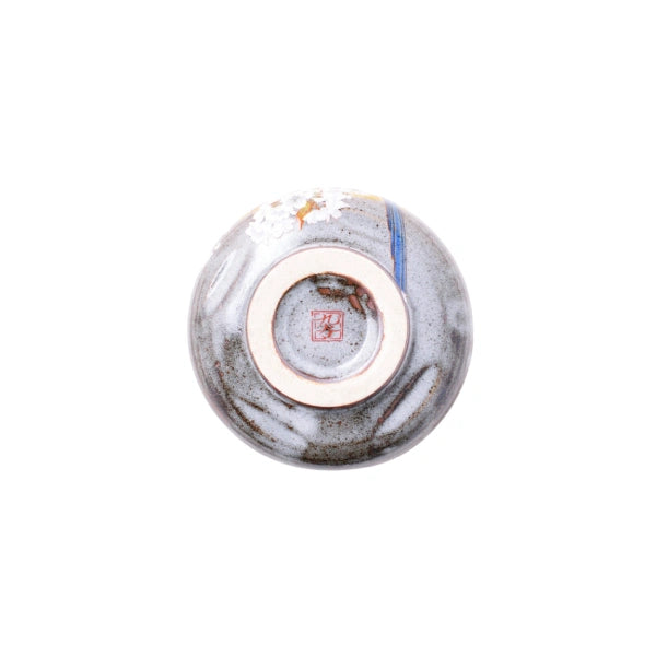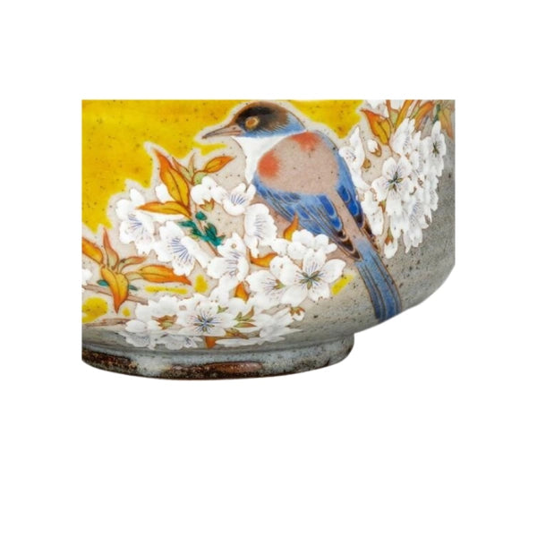Decorado con preciosas flores y hojas de cerezo blancas y un elegante pájaro, elementos que contrastan con los tonos blancos y grises del cuerpo del chawan. Al más puro estilo Kachō Fugetsu, escenas de arte natural mostrando elementos no creados por el ser humano y enfatizando la sensibilidad japonesa por la naturaleza intrínsecamente relacionada con el arte japonés.